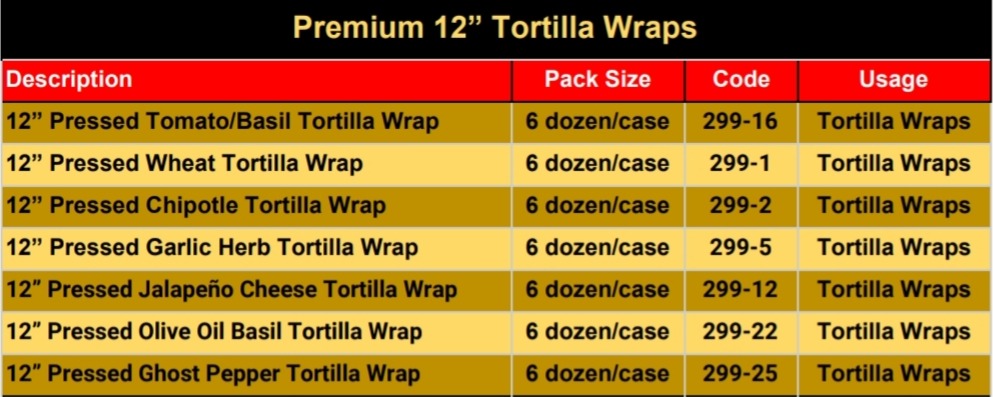 La Chiquita has a great selection of flavored wraps available in standard 12” size.