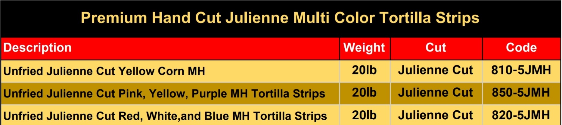 Our chips, corn and flour tortillas can even be done in Red, Orange, Yellow, Green, Blue, Purple, Pink and Black.